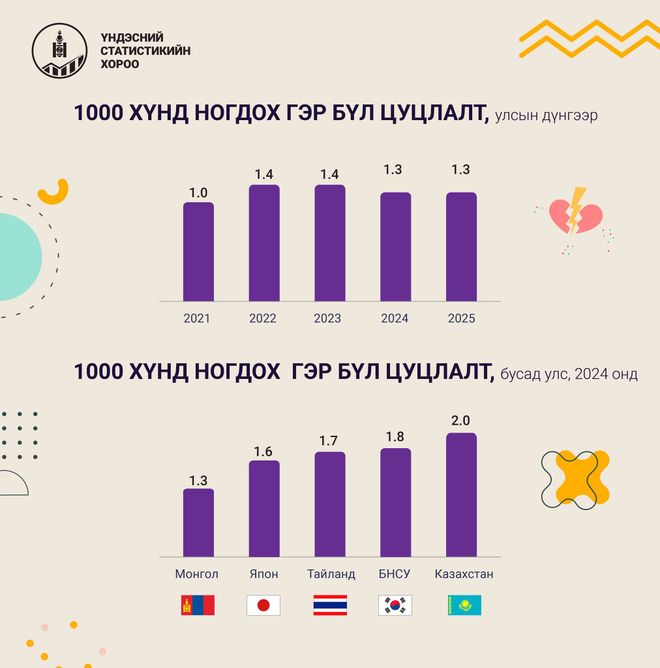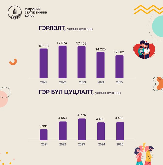 Улсын хэмжээнд 2025 оны байдлаар 12 582 хос гэрлэлтээ батлуулсан бол 4 493 хос гэрлэлтээ цуцлуулсан байна.